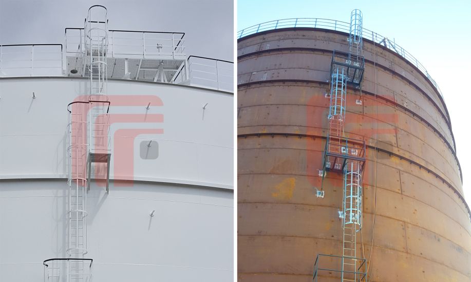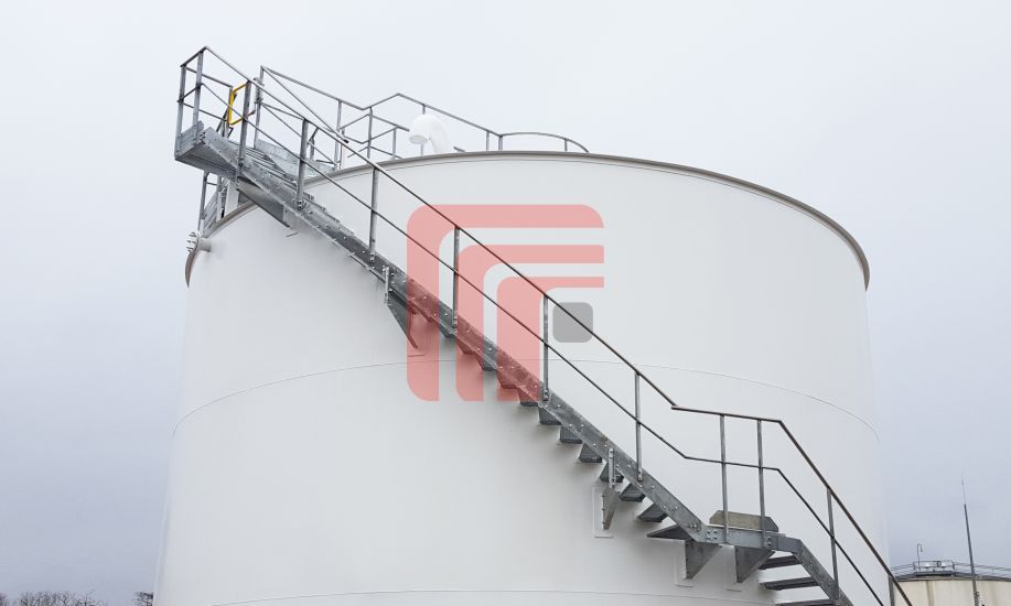 Construção de Escadas Helicoidais / Caracol para acesso a coberturas de Reservatórios Metálicos. São fixos à parede externa dos reservatórios, com plataformas de descanso providas de guarda corpos e rodapés protetores. Estas escadas são caracterizadas pela sua resistência química e leveza, sendo ideais para instalação em estruturas elevadas. As escadas helicoidais são ideais para paredes curvas, sendo construidas um degrau de cada vez, uma só peça e são encaixados entre si numa coluna central.