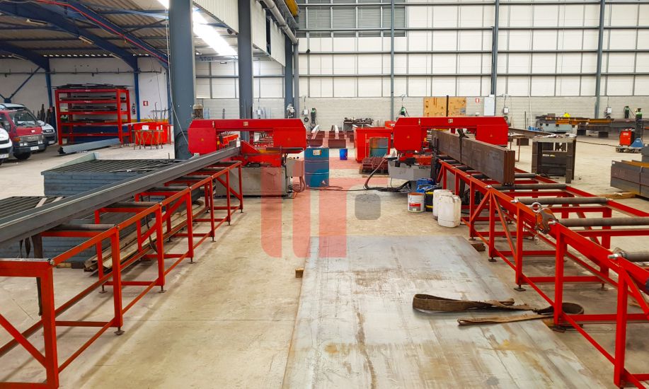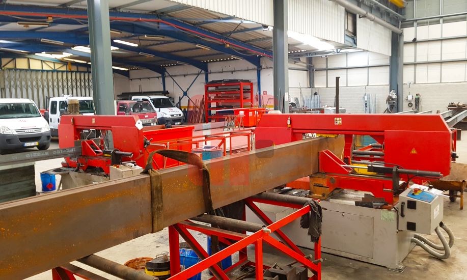 Linha de corte e furação de perfis com vários serrotes de fita.